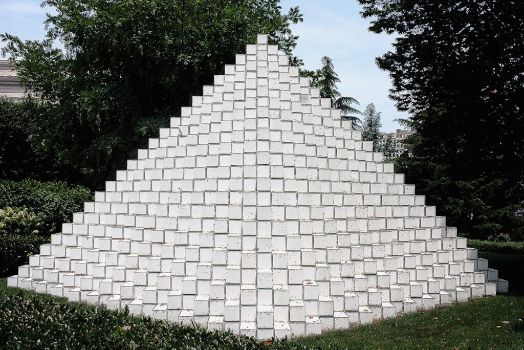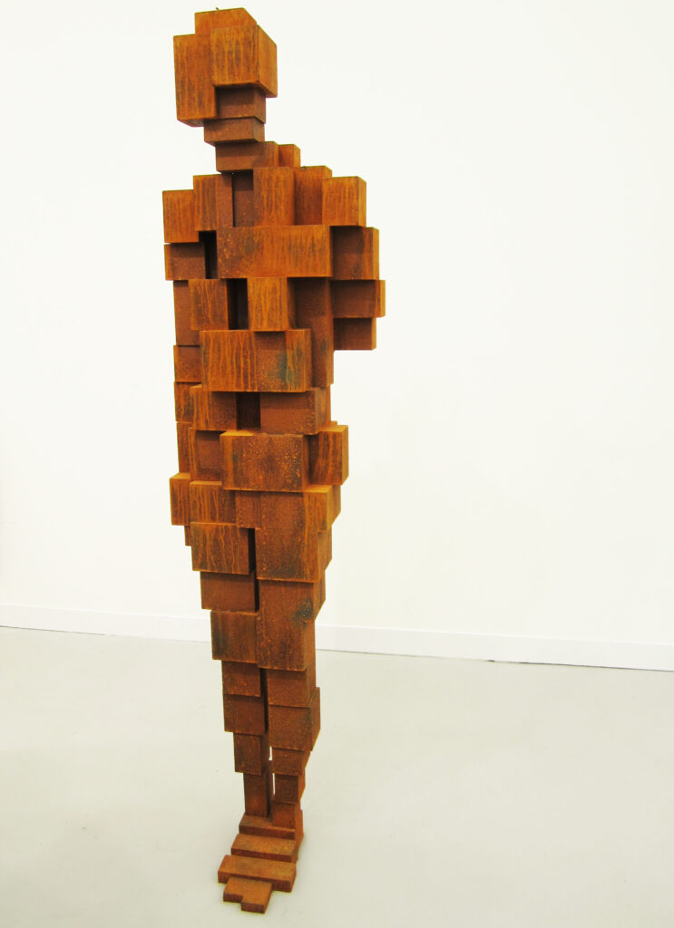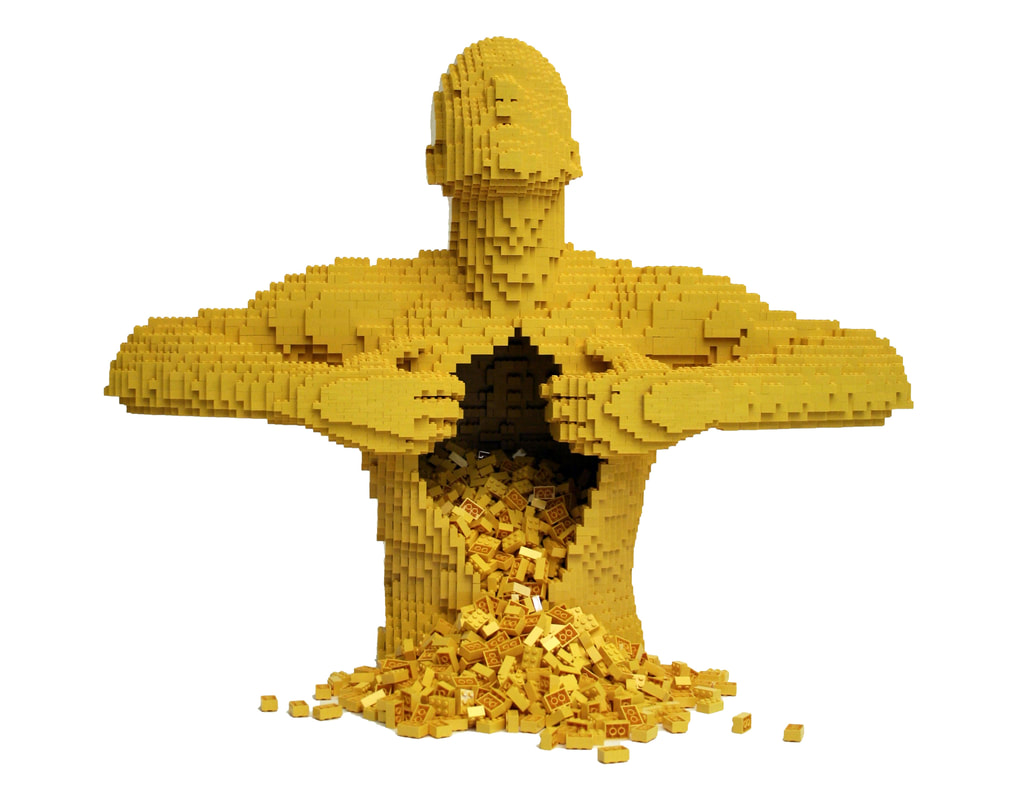 While not exactly cubes, the rectangular solids of Anthony Gormley imply a human figure at a low resolution, while a more modular grid structures a pyramid by Sol Lewitt. In a more playful venture, Nathan Sawaya uses actual Legos as his sculptural material.