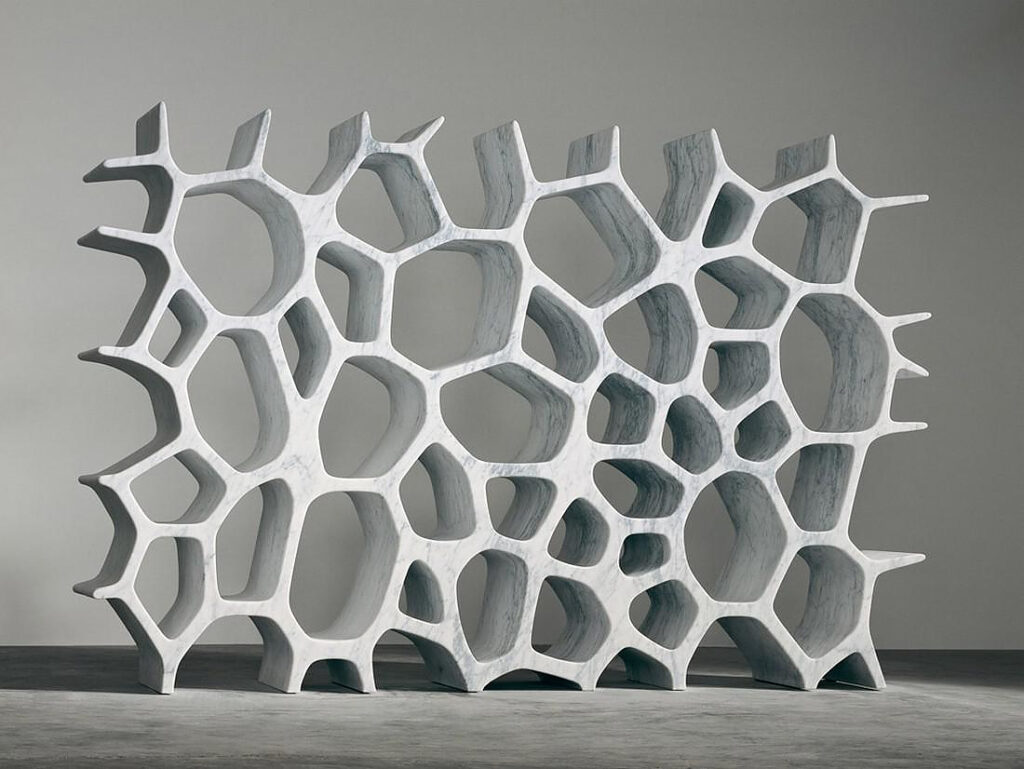 The Beijing National Aquatics Center, designed for the 2008 Olympics by PTW Architects, is not only an efficient structure, but a powerful metaphor for the activity it houses: swimming. Anthony Gormley — again! — shows his knack for expressing existential ambiguity in his Voronoi-inspired figure sculpture. Marc Newson uses gigantic CNC routing to carve a solid block of marble into his iconic Voronoi Shelf.