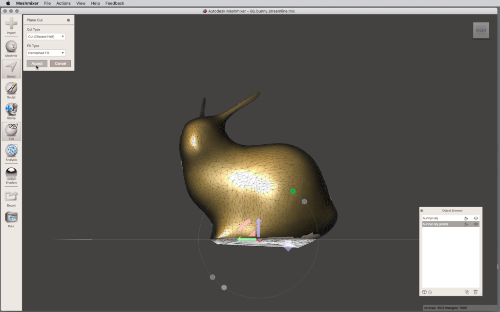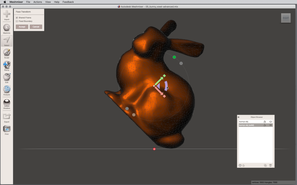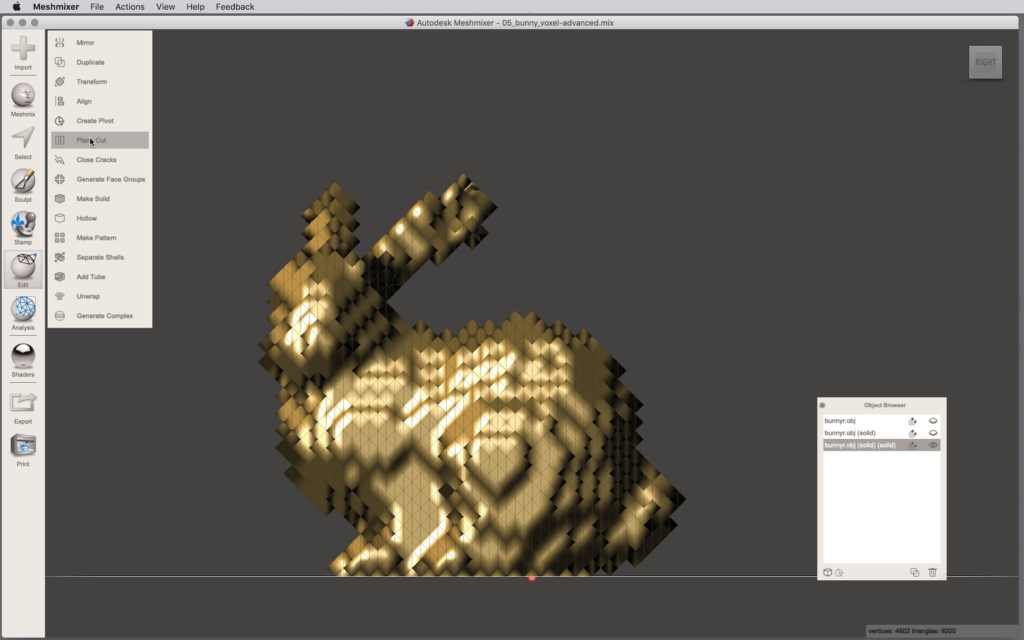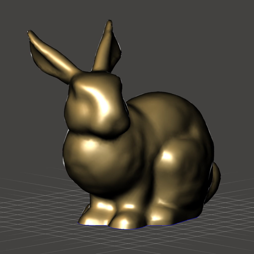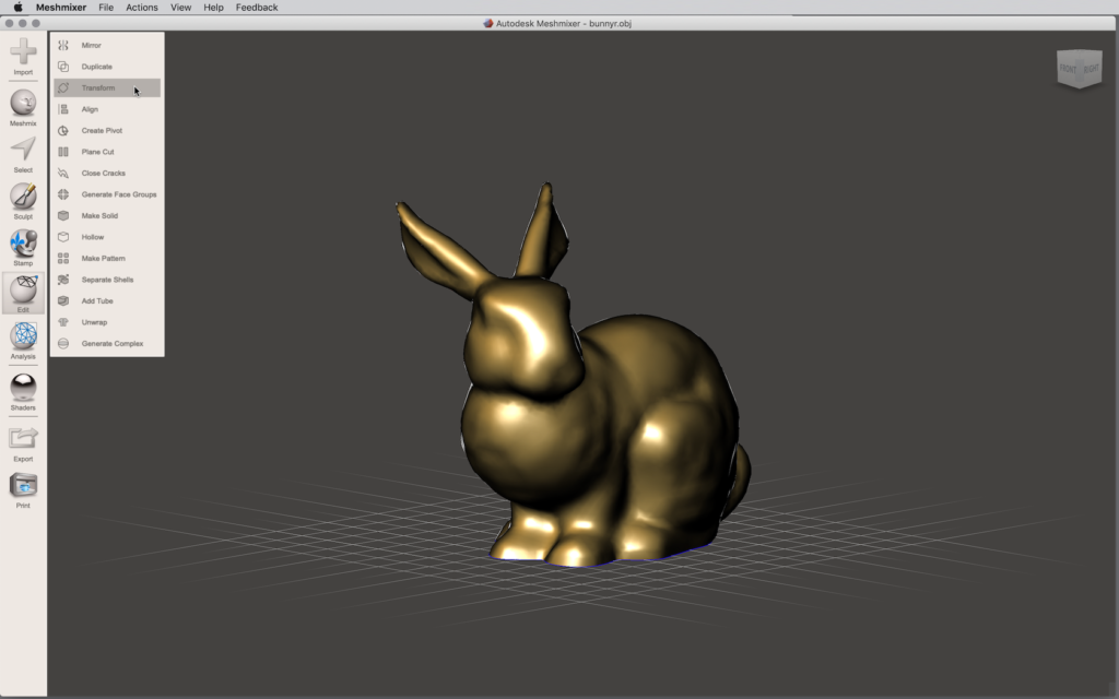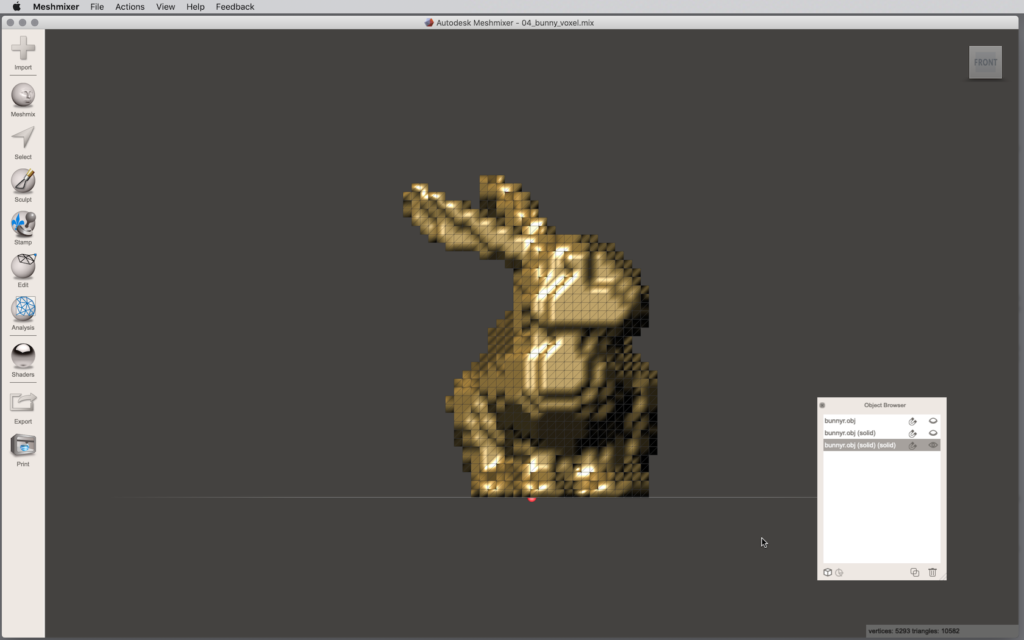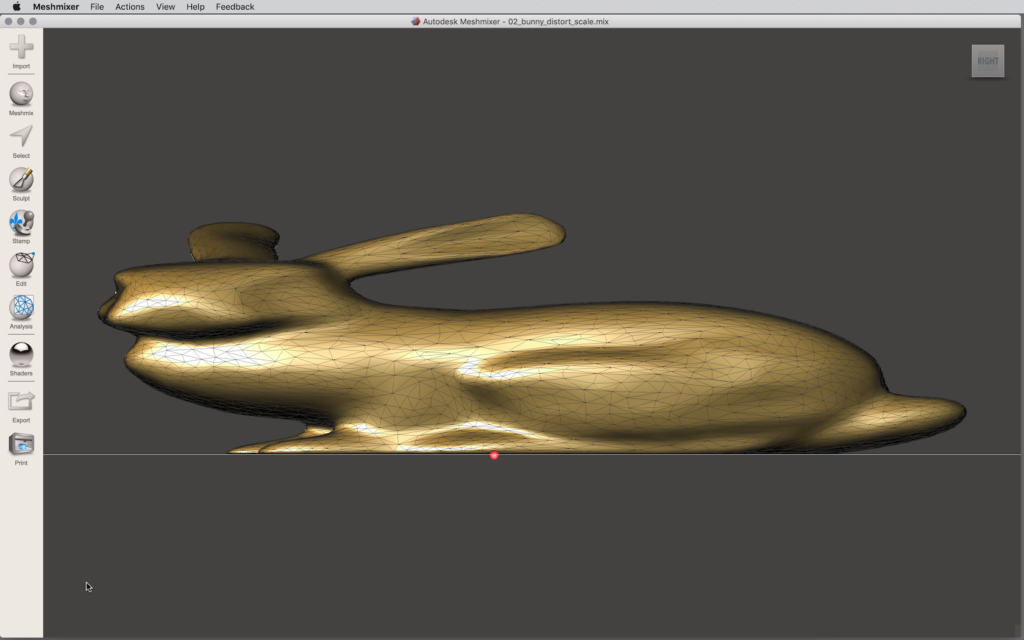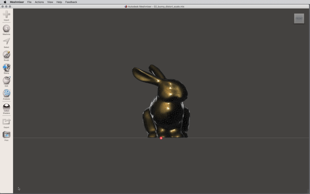 For this part of the exercise, you may choose to import your scan from above. If you don’t have one you like yet, you may import the Stanford Bunny standard reference object. Researchers at Stanford scanned this garden tchotchke back in 1994. Specifically, go to File>Import Bunny or select the Bunny’s icon in a new Meshmixer window. Avoid using the one in the Meshmix options at the Tool bar.