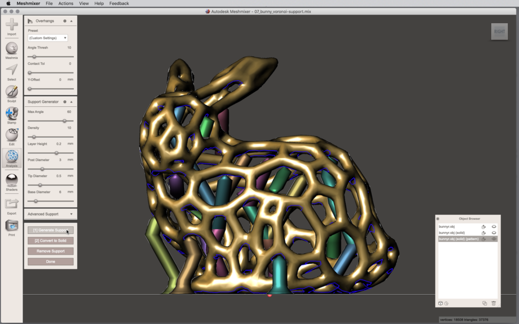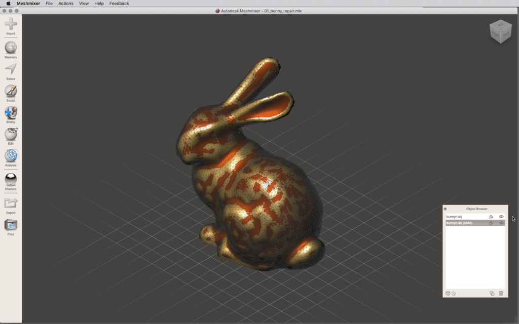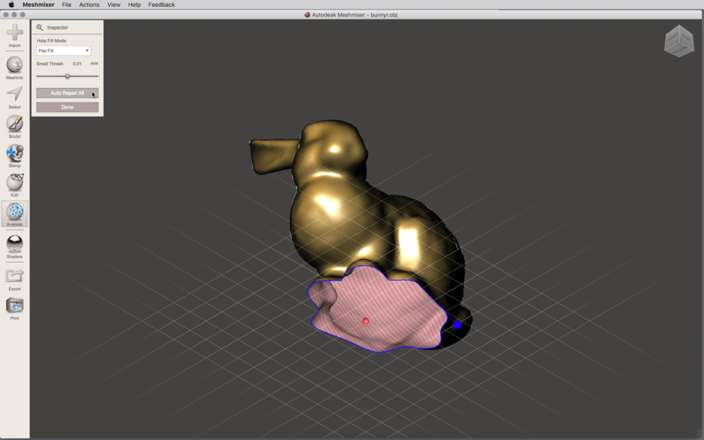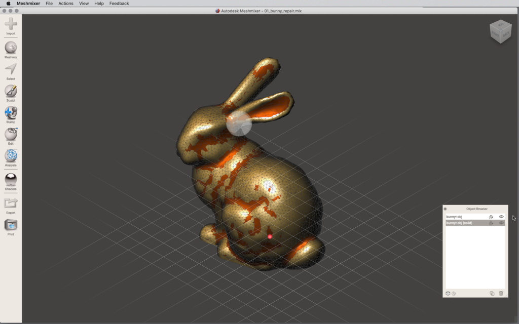 We want to repair (or at least be aware of) certain weaknesses in a file that may lead to problems in a print, and Meshmixer helps with an array of tools.