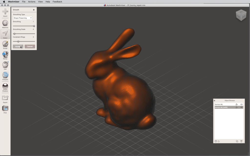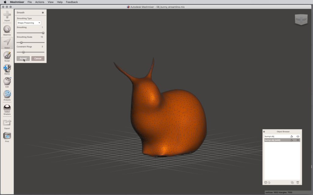 - In the dialog box, we use Shape Preserving and set the values to suit. For our Stanford Bunny, we used a high Smoothing of 1 and a Smoothing Scale of 15, to generate alien-antennae-like ears without making them too physically thin.