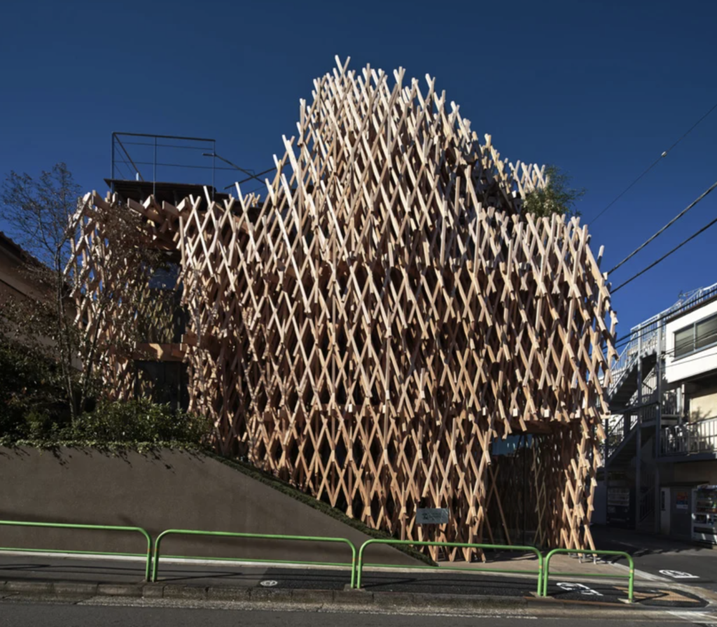 A lattice can imply volume through the intersection of stick-like elements in space. The sticks can imply an intersection of a Cartesian grid with an object, or they can develop out of more idiosyncratic ordering systems. An example of a diamond-based lattice is seen in Tokyo’s Sunny Hills Sweet Shop by Kengo Kuma — built by traditional Japanese woodcrafters without the use of nails or glue, it’s like walking into a giant basket. Sculptor Martin Puryear weaves a strictly modular orthogonal structure into his elephantine Big Bling, but explores a highly randomized orthographic structure in C.F.A.O.