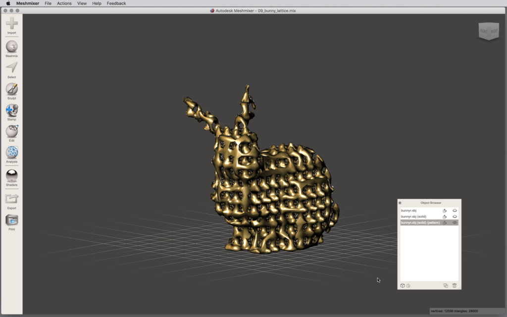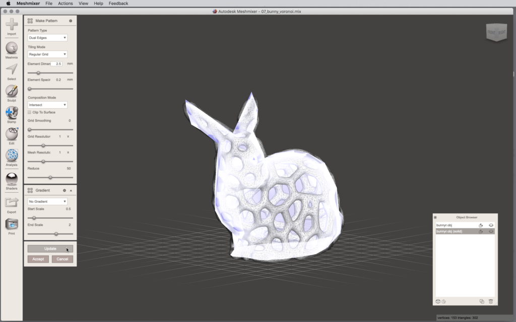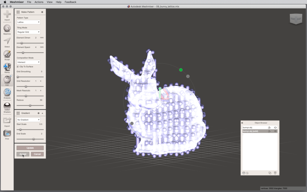 - Under Pattern Type, choose Lattice. For our Stanford Bunny, we accepted the default, but you can tweak variables here to suit. Be mindful that the lattice can create separated, floating pieces of the mesh, so inspect all around to avoid this.