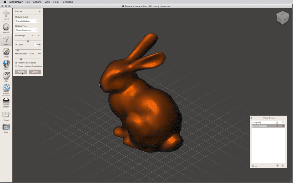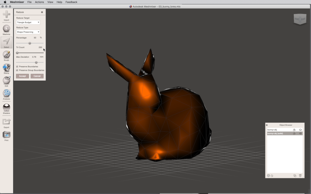 - Try Percentage from the Reduce Target dropout and type in 90 in the Percentage field (the slider is a bit sensitive). In our Bunny, we see just over 8000 faces when we hit Accept, with no appreciable loss of fidelity.