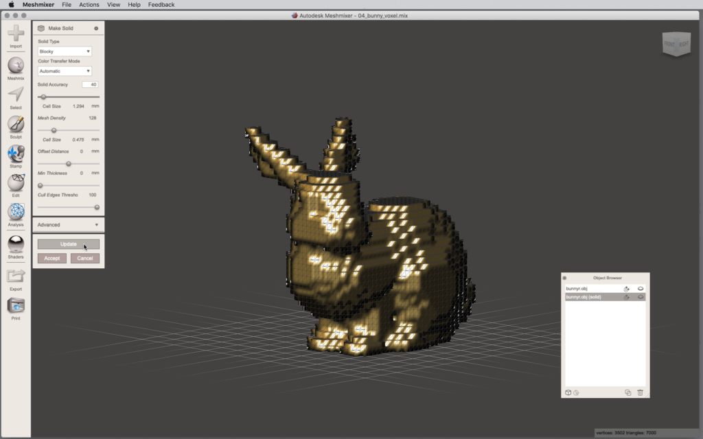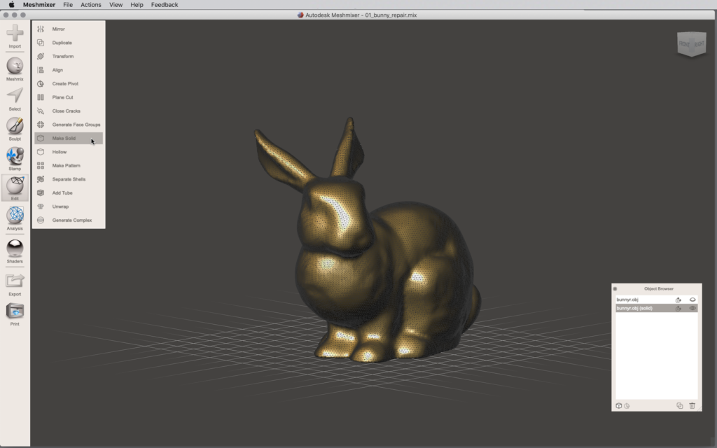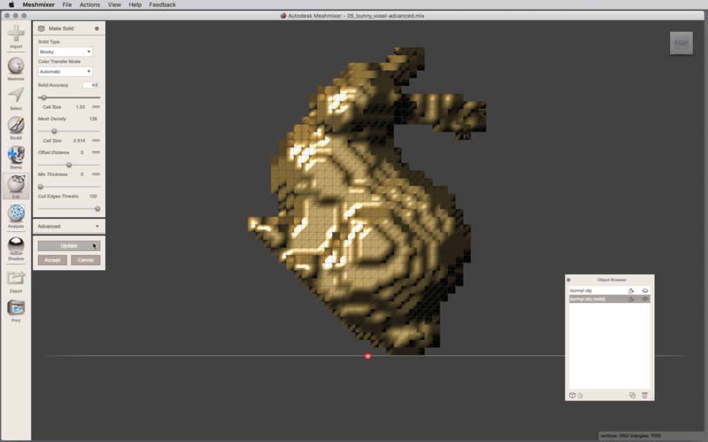 - In the Tool bar, enter Edit and select Make Solid. This effectively duplicates the original as a higher-density mesh. The Make Solid function can also further refine accuracy and mesh density by playing with variables in the dialog box. Other useful functions here are the Offset Distance and Minimum Thickness parameters, which can adjust too-thick or too-thin areas. Here’s the Autodesk help page for more.
