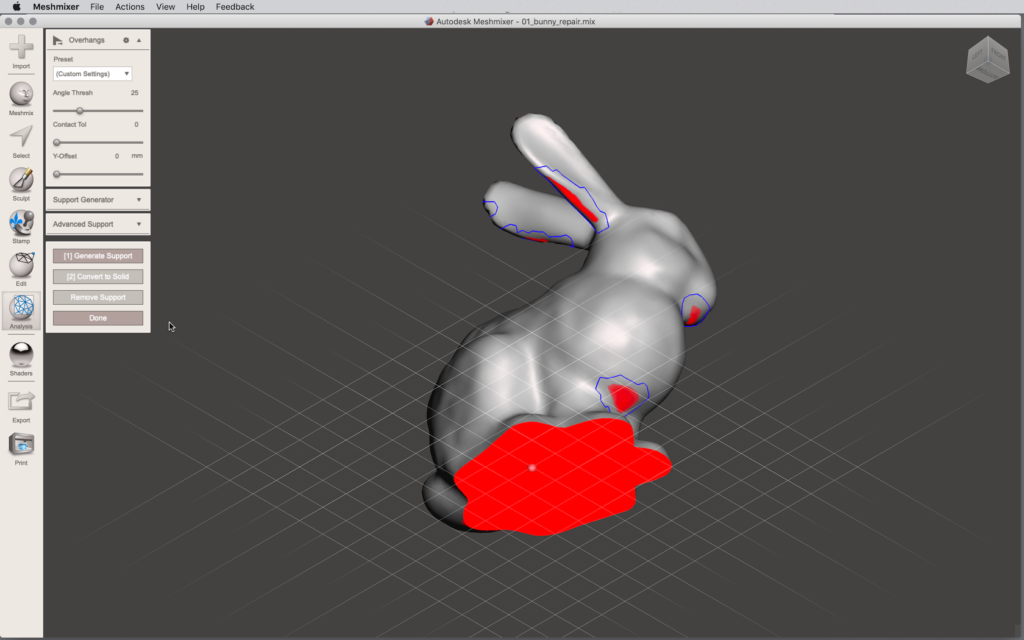 - Overhangs will predict the location of supports when you take it to the printer’s slicing program. In the Bunny, we can expect support under the ears, chin, and chest. These are seen best from a worm’s eye view. If we want, it will generate tree-style support structures which are sometimes helpful in avoiding an unwanted mass of vertical supports.