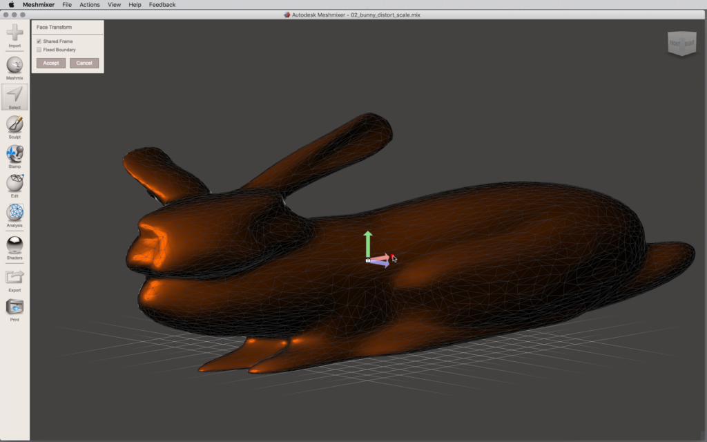 In our non-uniform scaling distortion of the Stanford Bunny, we see how Select>Deform>Transform opens the transform widget, which we select and pull only in the Y-axis direction to distort. When done, hit Accept and view from the ortho Right and ortho Front to see the strange phenomenon known as 3-D anamorphic projection.