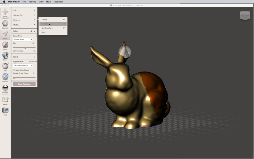 - Make a selection of a portion of the mesh using Select, and you’ll see new functions appear at the top of the Select dialog box. Find Deform > Transform and the transform widget appears.