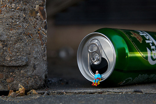 On the other side of the scale street, where big becomes small, we might find street artist Slinkachu, creating perhaps the world’s smallest figure sculptures and placing them to create random, surreal encounters with his audience.