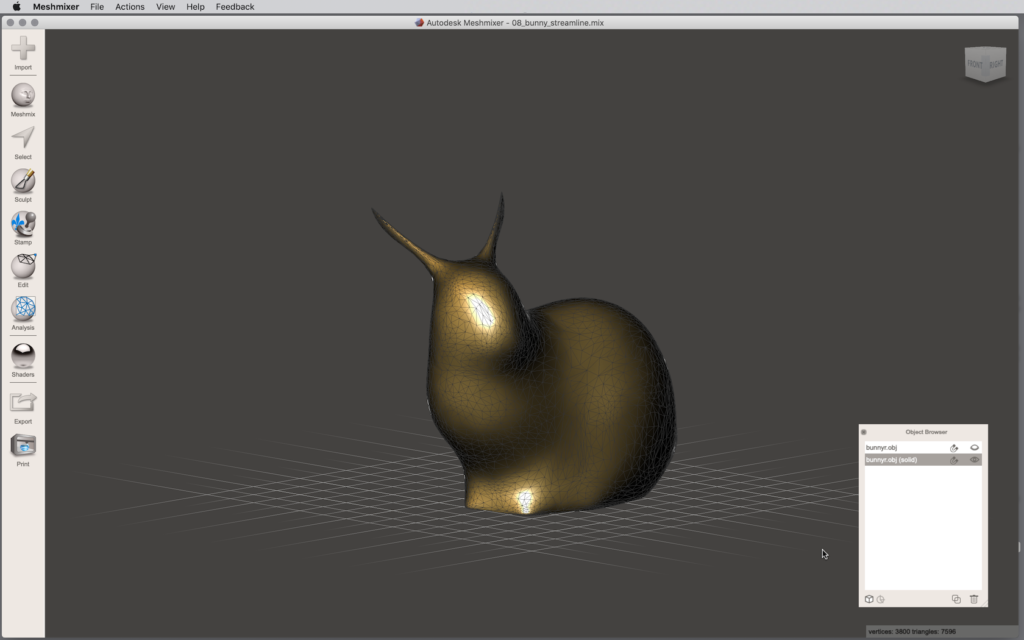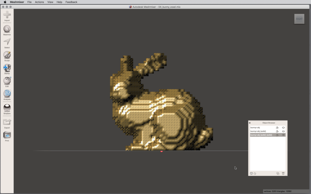 - Select the smoothed mesh with CMD+A and note the number of triangles indicated in the lower right corner of the viewport. In our smoothed Bunny, it’s well north of 80,000. Forget printing this or importing it to Fusion!