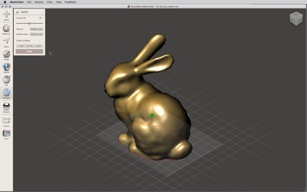 - Center of Mass will show you if your scan has a center of gravity and a base that will allow it to stand if that’s a virtue you seek. The green sphere reveals a center of gravity well within the red line scribing the surface contact with the ground plane for our Bunny.