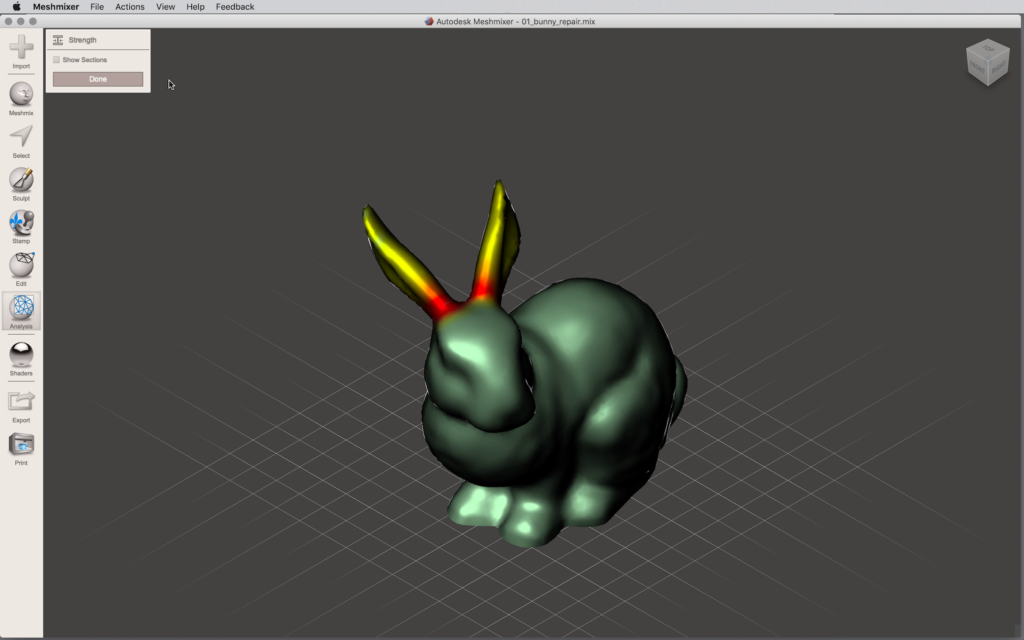 - Strength will show you a heat map of potential weak spots, where red is weaker. We see on the Bunny a red-hot weakness at the base of the ears. No repair is suggested here, but we could select and thicken this area with an Edit tool. We don’t elect to do that in our sample, because it’s common for cantilevered objects like arms and ears to show structural stress at a joint. It’s worth the risk in our sample to maintain fidelity to the original.