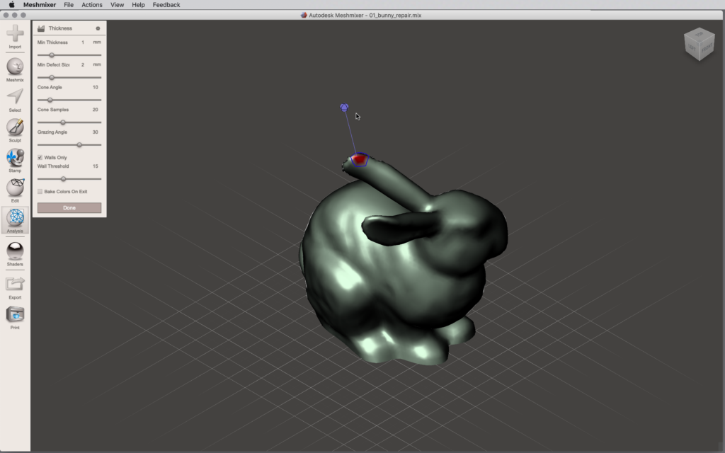 - This function will detect potentially fail-prone wall thicknesses, which you can repair by clicking on the warning sphere. In the Stanford Bunny, a tricky place at the tip of the ear is revealed, and we repair it.
