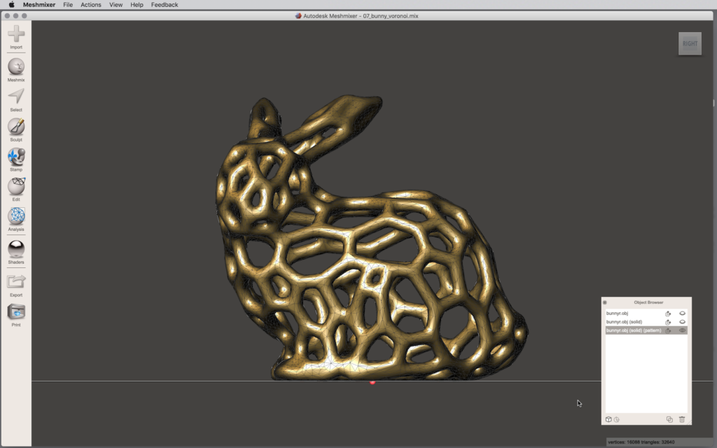 - First, make a low-res version of your mesh by following the Low-res workflow above. We use a copy of the Lo-Res version of our Stanford Bunny. The number of triangles we create in a low-poly model will generate the Voronoi cells.
