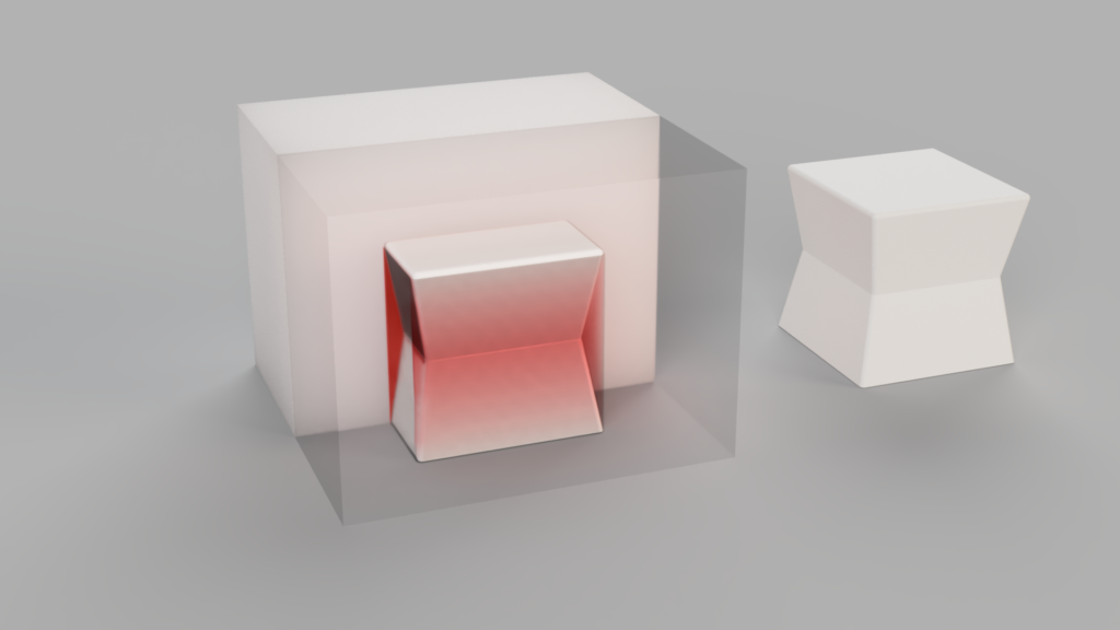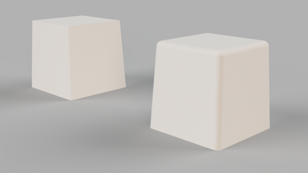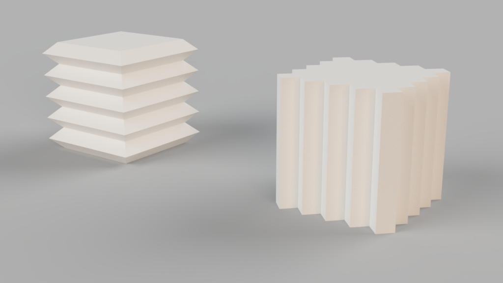 However, this vertical texture still presents a problem: it increases the surface area by about 1.5 times that of a smooth cube! This significantly increases the amount of friction that we feel when we try to remove a mold from a model. This doesn’t matter in an abstract digital 3D world, but if you use the mold you fabricate, you may need to destroy it to free the cast. However, this fate can be avoided with draft angles.