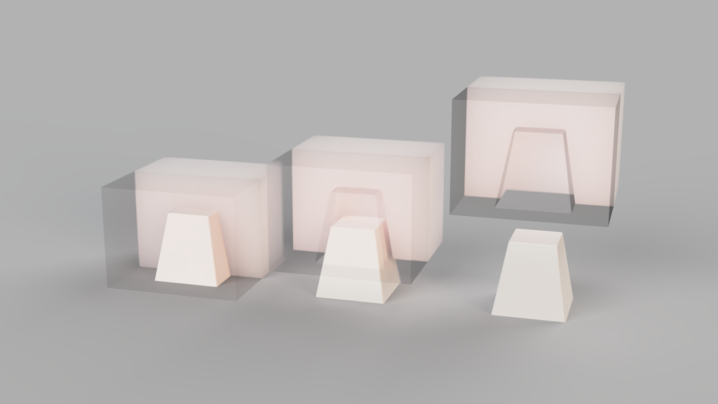 To help visualize this a bit better, the rendering below shows the truncated pyramid model in a mold. The front half is rendered transparent to help us see how the object is easily removable because no undercuts are present.
