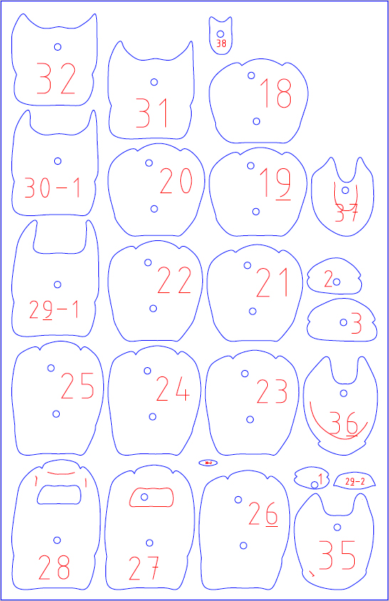 Open your PDF in Adobe Acrobat or Illustrator and you’ll see a series of blue and red vectors. The blue vectors are the cutout lines, while the red vectors are labels indicating some order. Be aware: those red letters and numbers are not text—they are vector geometry in the shape of text!