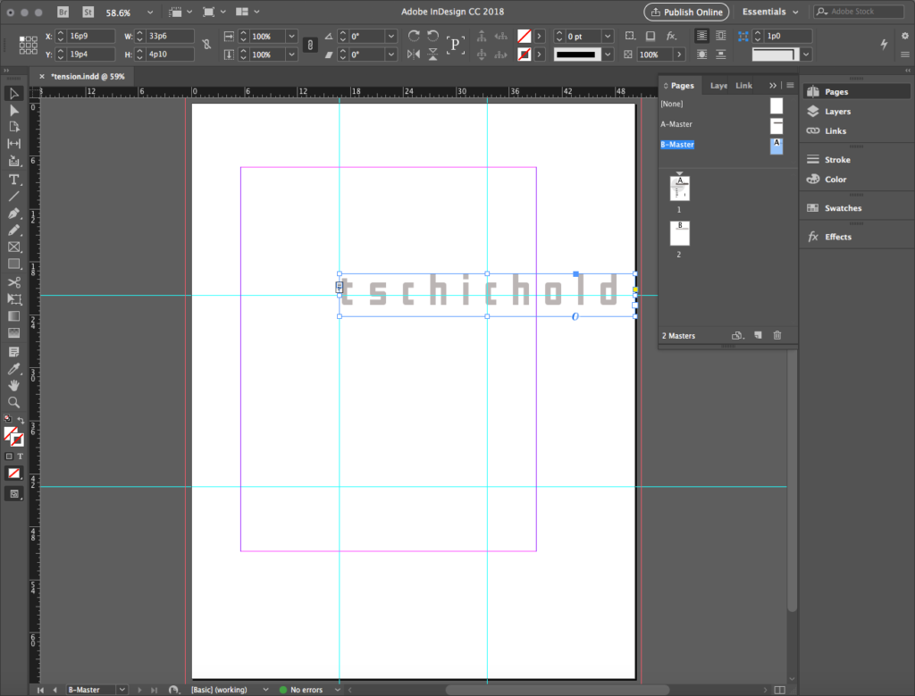 Look for the B-Master in the Pages Palette, and double-click to highlight it and present it in the viewport. You’ll see our old friend “tschichold” in 15% value for all channels in CMYK.