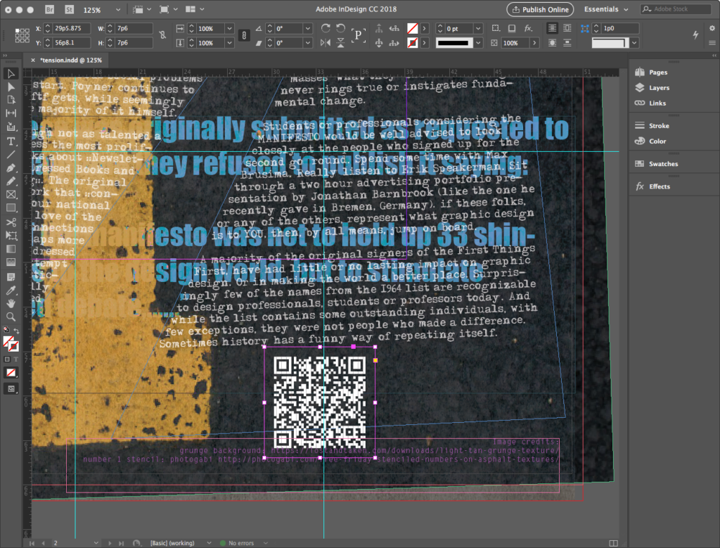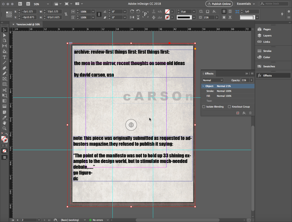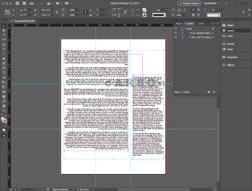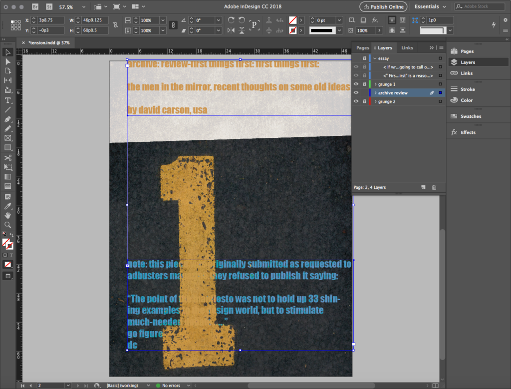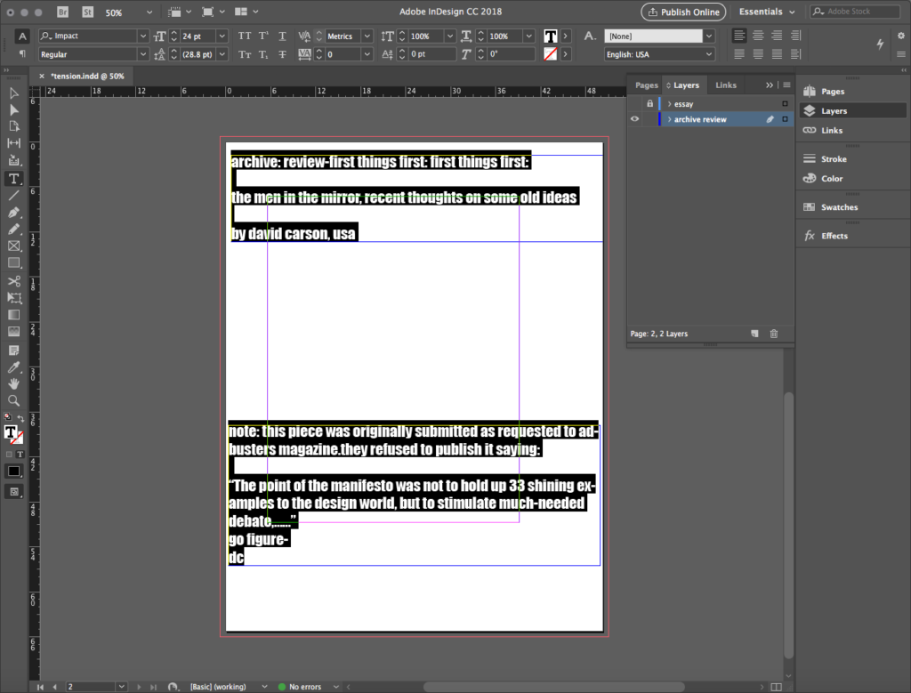 For this exercise, we will use the untouched Page 2 from the Unity exercise. This will become the platform for an approach to graphic design that resists the rules of the grid. Creating tension with a sense of chaos among type and images was part of the Futurist, Constructivist, and Dadaist anti-art aesthetic in the early 20th century.