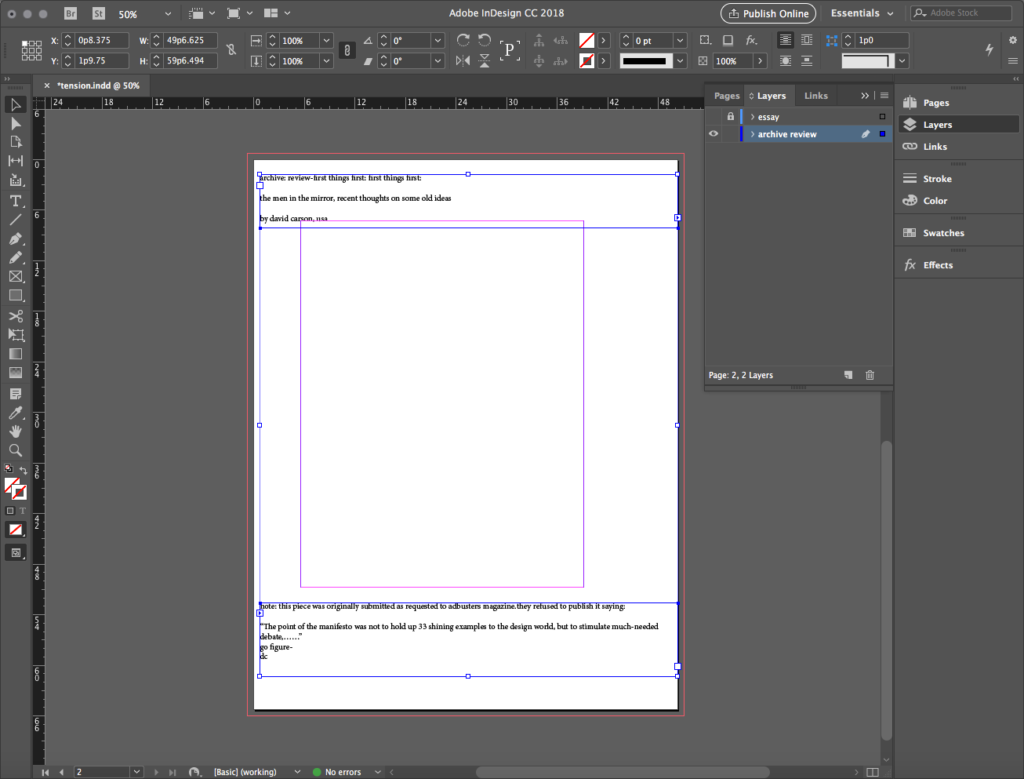 Our next job is to manipulate the text boxes on the essay layer, so turn this on and unlock it. For clarity, turn off and lock the archive review layer.