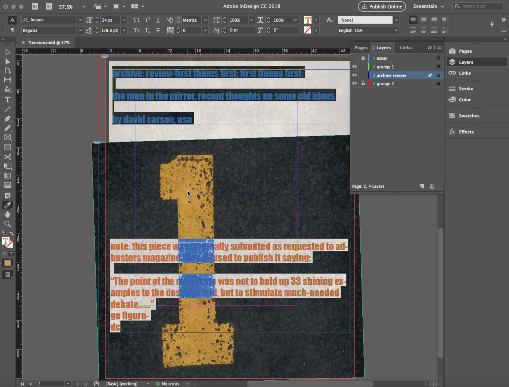In our sample, notice the image completely obscures the bottom text frame for the archive review layer. So, we apply a Hue blending mode to the image in Effects, and the hidden text appears! We lock the grunge 1 layer, keep the essay layer locked and hidden, and select all the text in the remaining visible frames. With the text selected, we use the Eyedropper Tool to capture the yellowish “1” color and apply it to the text.