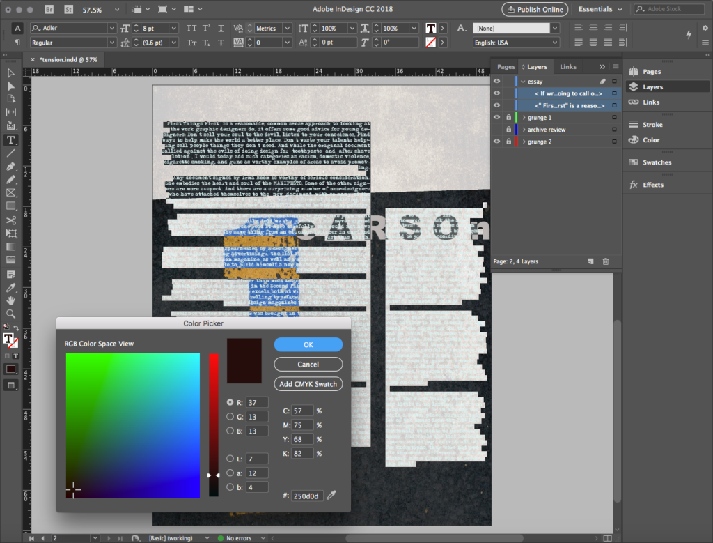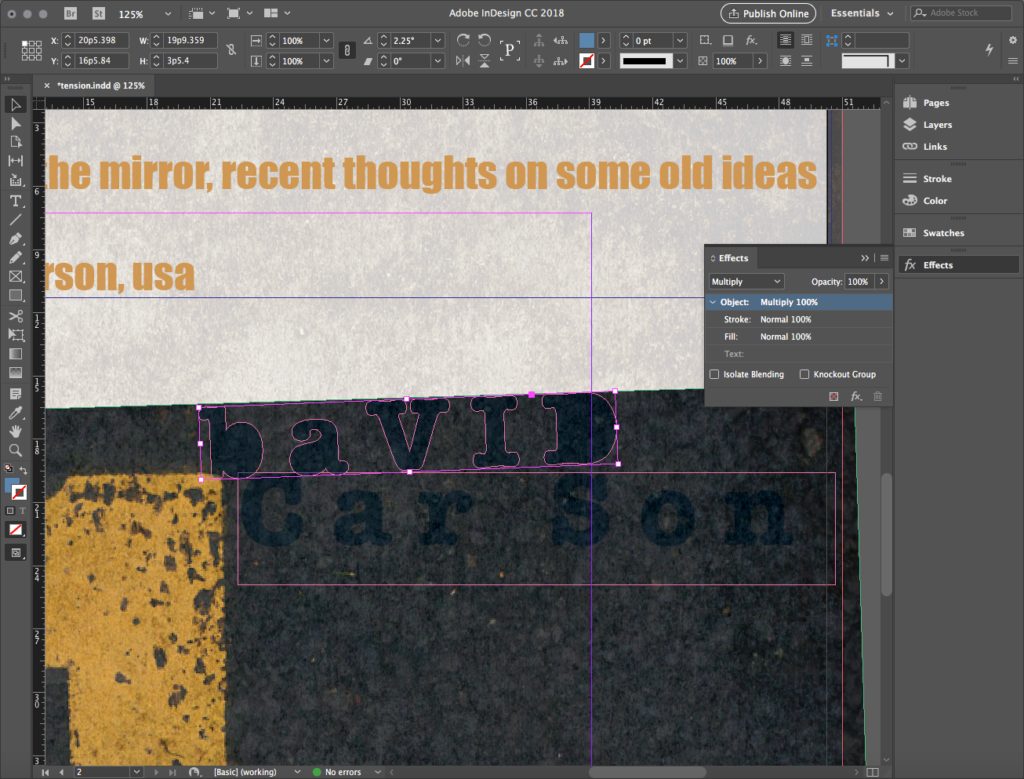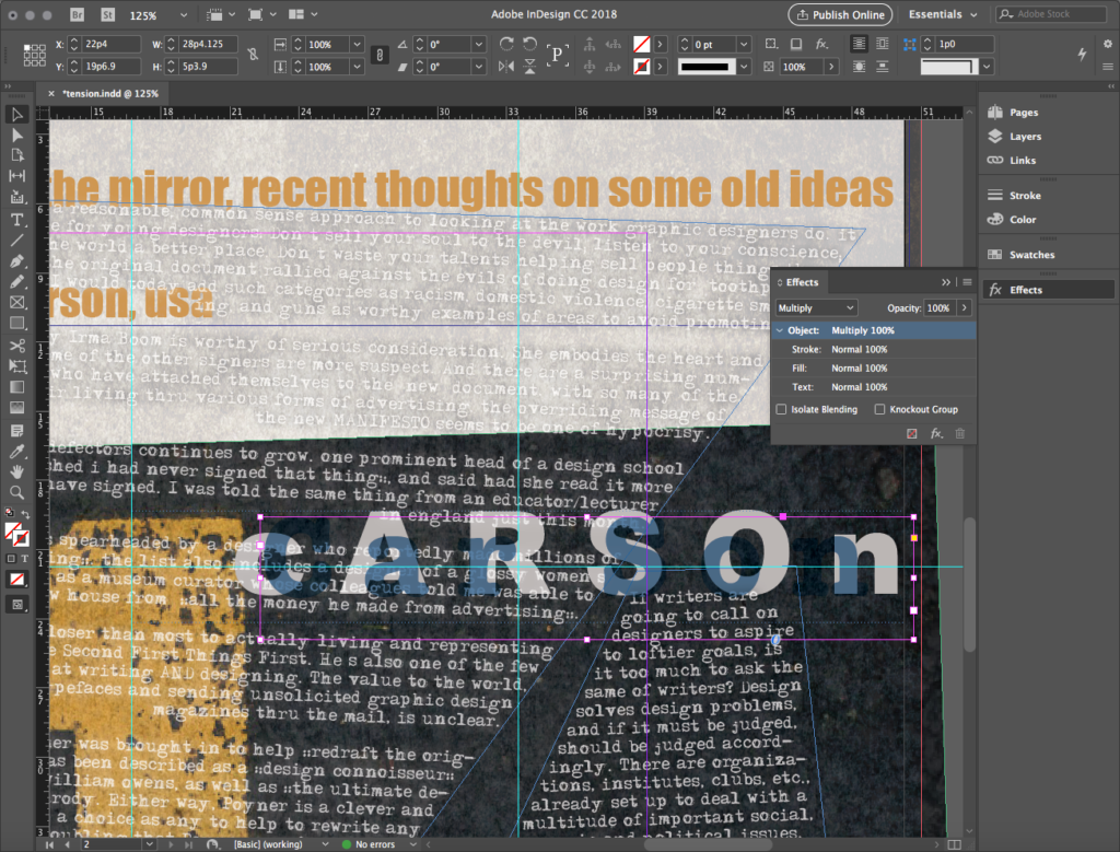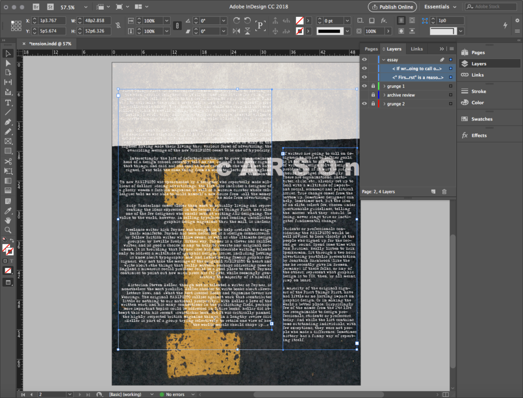 First, we want to toy with the legibility around the “cARSOn” text brought in by the master layer. We can overlay text boxes and apply colors and blending modes that create interesting effects with the essay author’s name as a featured text element.