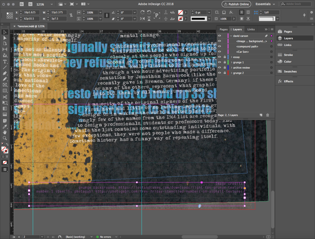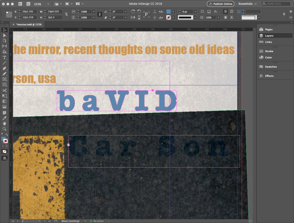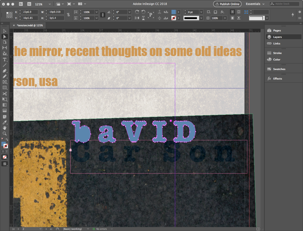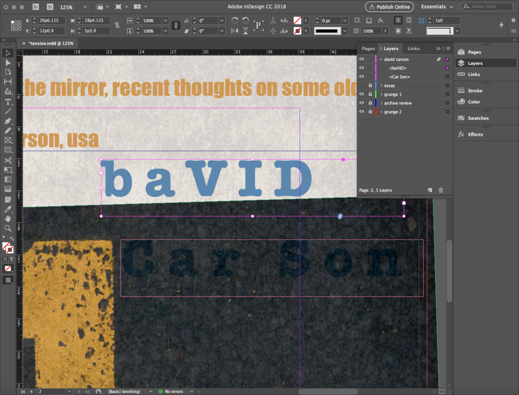 We’re back to some mandatory moves in this final section. Two more items will go into david carson layer to finish up the exercise, then we can output it as a PDF.