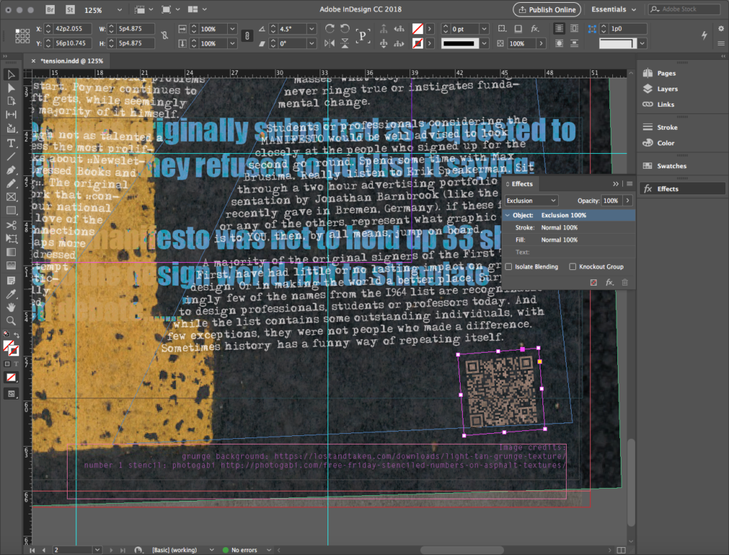The white is rather stark. QR code scanners use contrast to read these two-dimensional bar codes, but the codes are quite redundant and can withstand some manipulation. To make it interesting, we apply an Exclusion blending mode under Effects. But CAUTION: ALWAYS test the scan to make sure it still has enough contrast for a mobile device scanner to read it.