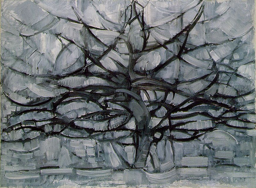 We can deduce the formal lattice structures found in a canonical Mondrian painting have their origins in structures he observed in nature, particularly the spatial layering and directional visual forces found in bare tree branches. It’s not correct to say his later paintings are abstractions of trees. But they evolved from that into his classic, strict vocabulary.