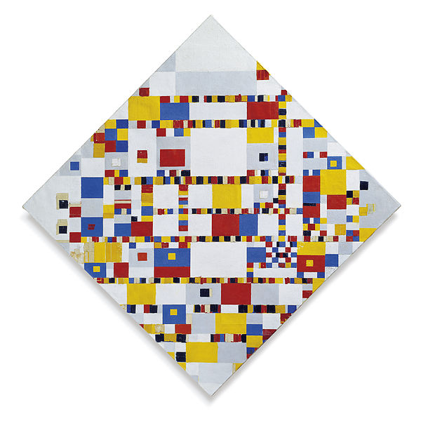 There is a clear analogy to the vital, dynamic energy of boogie-woogie jazz in Mondrian’s New York paintings. His last, unfinished masterpiece, Victory Boogie-Woogie, reflects as much, not only in the explicit reference in the title but in the emphasis on visual counterpoint. If the black lines of the earlier work are the beat and the colored planes counterpoint, this final painting is pure syncopation. Most commentators agree that the multiple rhythms and overlaid grids of New York are reflected in the work.