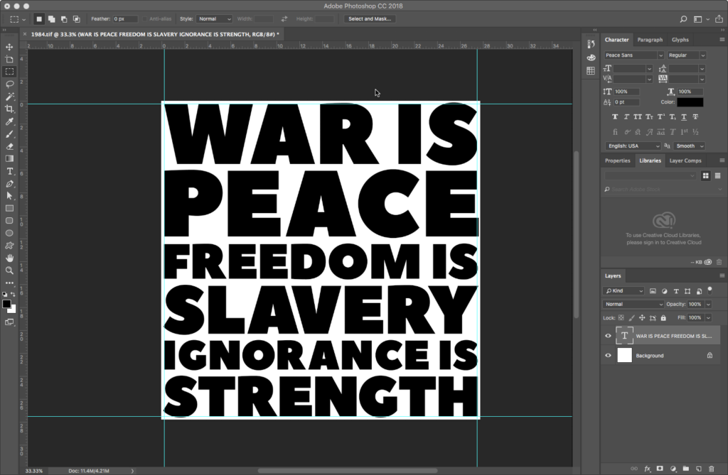 Create a new Photoshop document at 2000px x 2000px at 72 ppi resolution, with a white-filled Background layer. Create Guides set at 0.25 inches in from every edge. Save it right away as a TIFF file named 1984.tif.