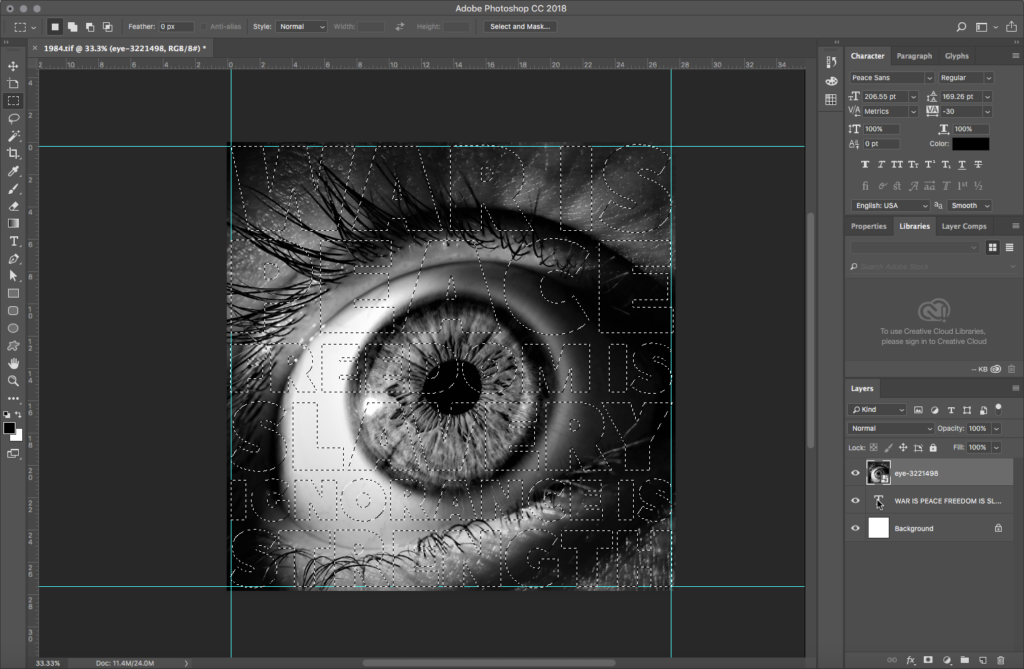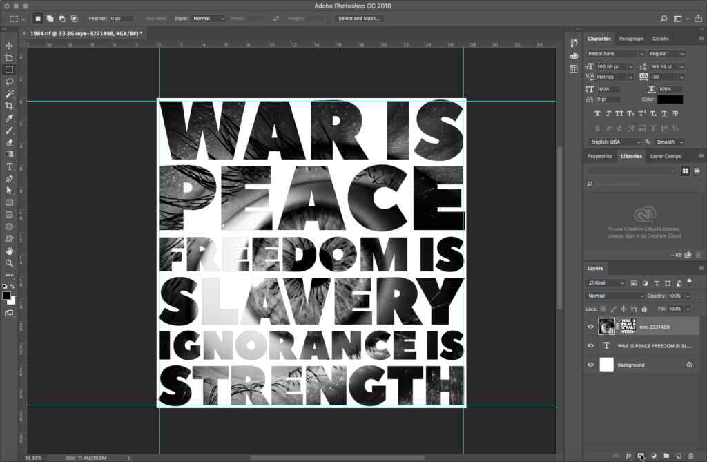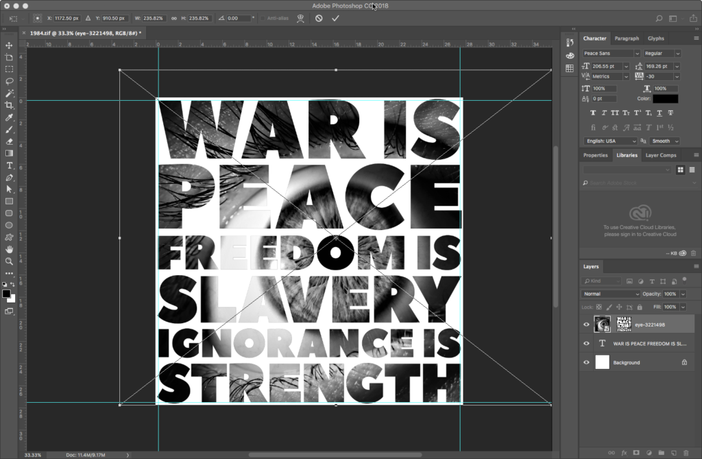 Place the eye image on top of the text layer by dragging the eye image icon from its Finder window over the Photoshop viewport. This creates a Smart Object layer. A Smart Object is a layer that externally references another file. If the file linked via a Smart Object is edited, those changes will automatically update in the layer. As is the case with all external references, the eye file referenced by the Smart Object layer needs to stay in the same folder as the 1984.tif file. If you move either file from its project folder, the external reference will break. So in such instances, remember: the project is the folder, not the file.