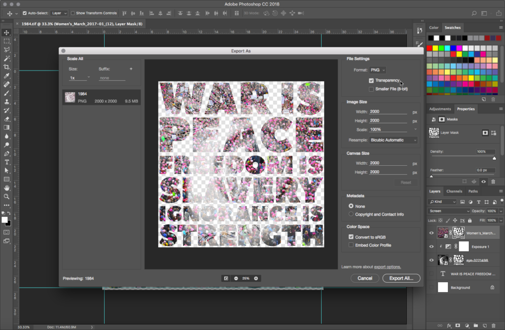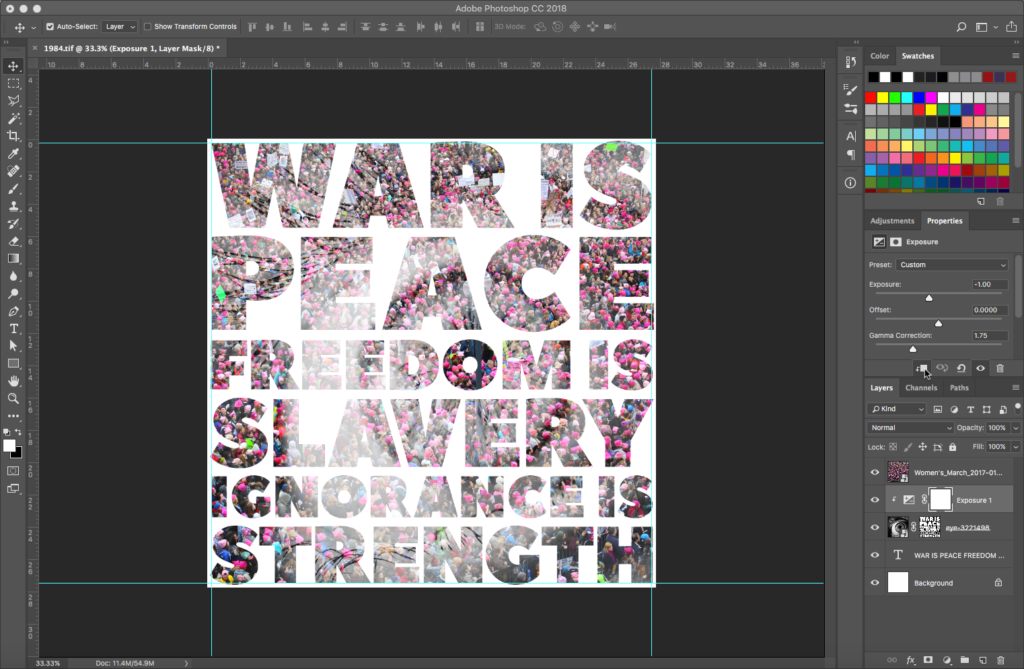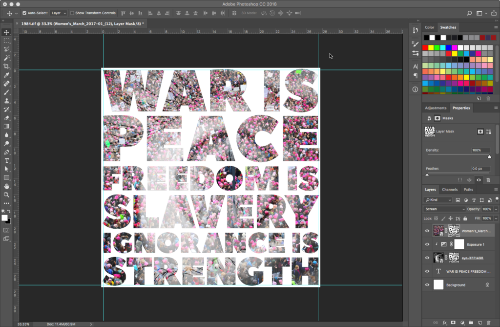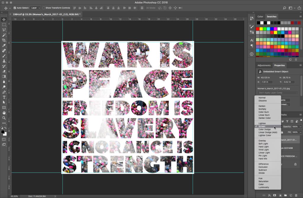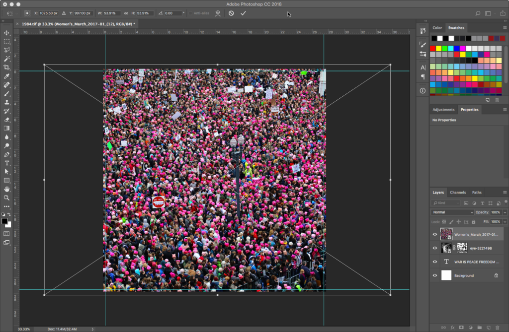Place the women’s march image on top of all layers the same way you added the eye image, creating another Smart Object. Resize as needed: