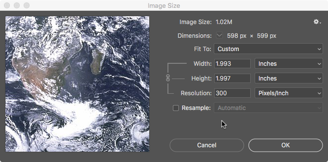 Notice that the image has a low resolution — its file size is small and its pixel dimensions are just under 600 by 600 pixels. Look inside the Image Size dialog box (Image > Image Size) to see that unchecking the Resample Image button and setting the printing DPI to 300 will result in a print close to 2 by 2 inches. Press Cancel to return to standard editing mode.