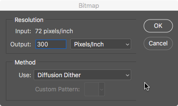 Choose Image > Mode > Grayscale, and press the Discard button at the Discard color information warning. Then, choose Image > Mode > Bitmap, and press OK through the Flatten layers dialog box. Type 300 in the Output Resolution box. Press OK to exit the dialog box and your image will have a dot pattern throughout. The results are below.