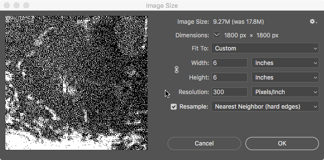 Choose Image > Image Size to sample the RGB image to the correct size and number of pixels for out intended output. Check Resample using Nearest Neighbor (hard edges) to preserve the pattern created by the bitmapping. With the chain link between Width and Height deselected, set each to 6 inches. This will correct the small deviation from square formatting to a perfect 6 X 6 image.