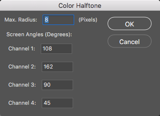Apply the Color Halftone filter by choosing Filter > Pixelate > Color Halftone. Here you can alter the Max Radius, which changes the size and spacing of the dots that the halftone produces. When the dots are closer or further apart, the resulting image becomes more or less obvious due to abstraction made by the dots. We set the Max Radius at 8, as the results fit our expectations for this image.