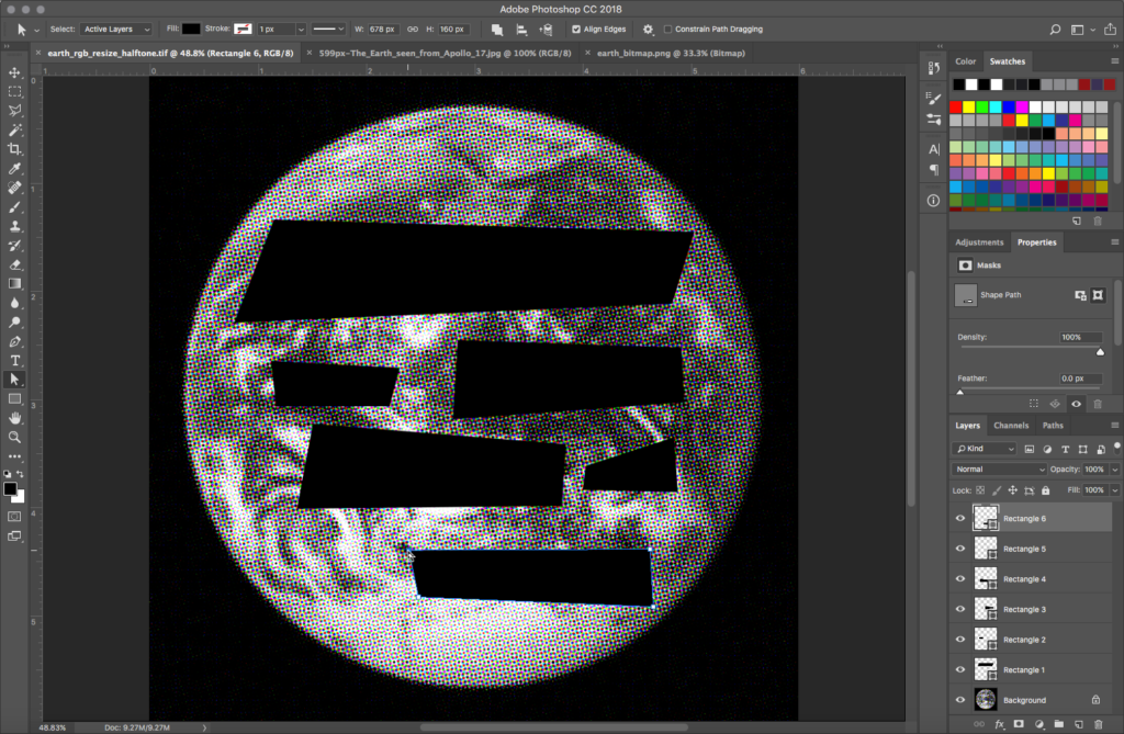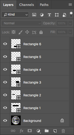 Make sure black is loaded in the foreground color chip by pressing the letter D shortcut on your keyboard. Create six rectangles with the Rectangle tool. The Rectangle tool produces vector shape layers. Vector art is defined by a formula, rather than by pixels. Since the rectangles are not comprised of pixels, they can be scaled or skewed without degradation to their image quality. This smooth, high resolution quality will add contrast to the bitmap halftone image. Each rectangle is defined by the four anchor points at the corners of the shape. These anchor points can be repositioned, and the shape will continue to be filled with the fill color, in this case, black. Notice that each time you draw a new rectangle, a new shape layer is added to your Layer panel.