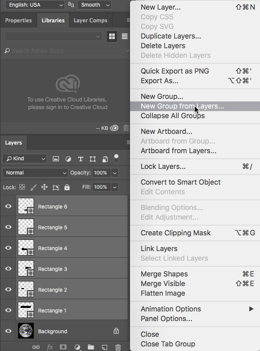 Organize the Layer panel. Shift+click the shape layers: activate Shape 1 then Shift+click on Shape 6. Use the Layer panel pull-down menu to choose New Group from Layers. Name the new layer group shapes.